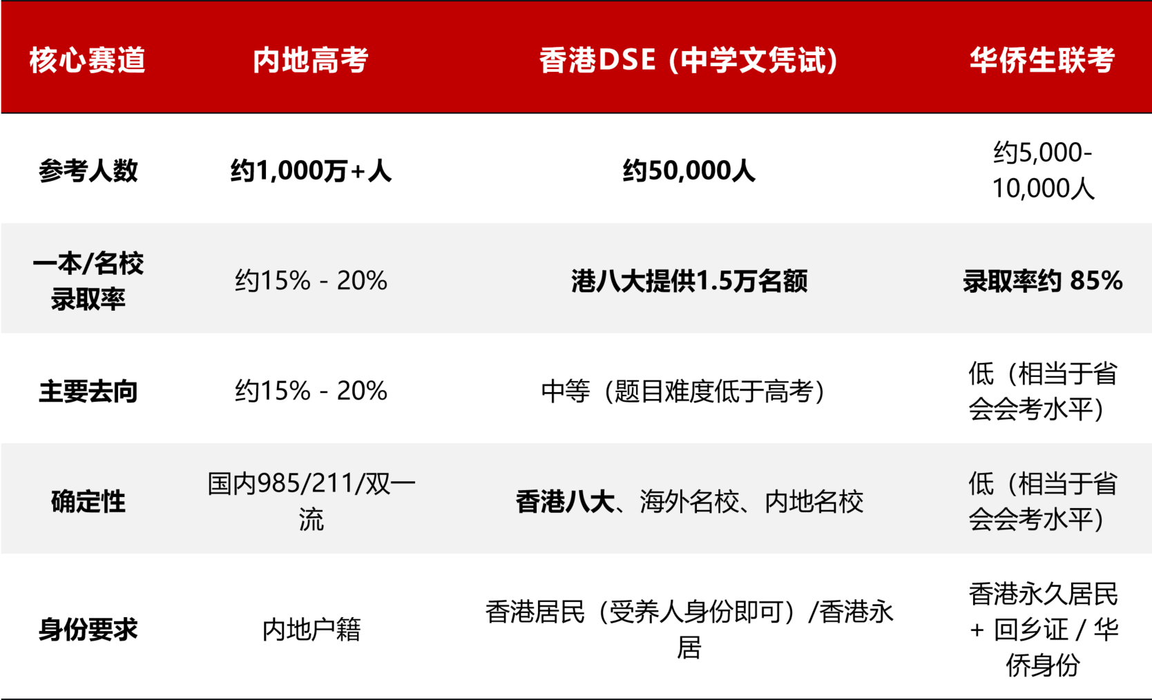 孩子未來不一定只能走內(nèi)地高考一條路,還可以考慮香港DSE、華僑生聯(lián)考,甚至銜接海外升學(xué)。相較于傳統(tǒng)的僅通過戶籍跨?。ㄌ旖颉⒑D下鋺簦┑葘?shí)現(xiàn)高考分?jǐn)?shù)降低,僅能解決單一升學(xué)問題,無法為孩子提供長期發(fā)展支持。在香港升學(xué)能為子女帶來除了教育以外的國際視野與長期事業(yè)和生活價值。