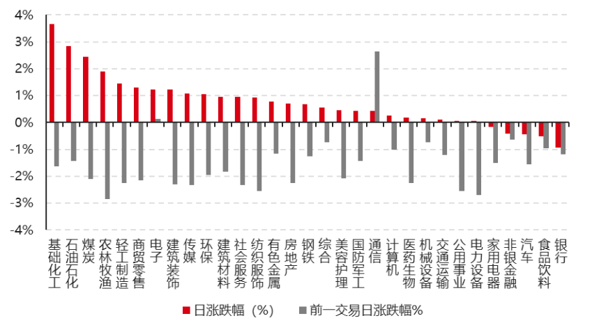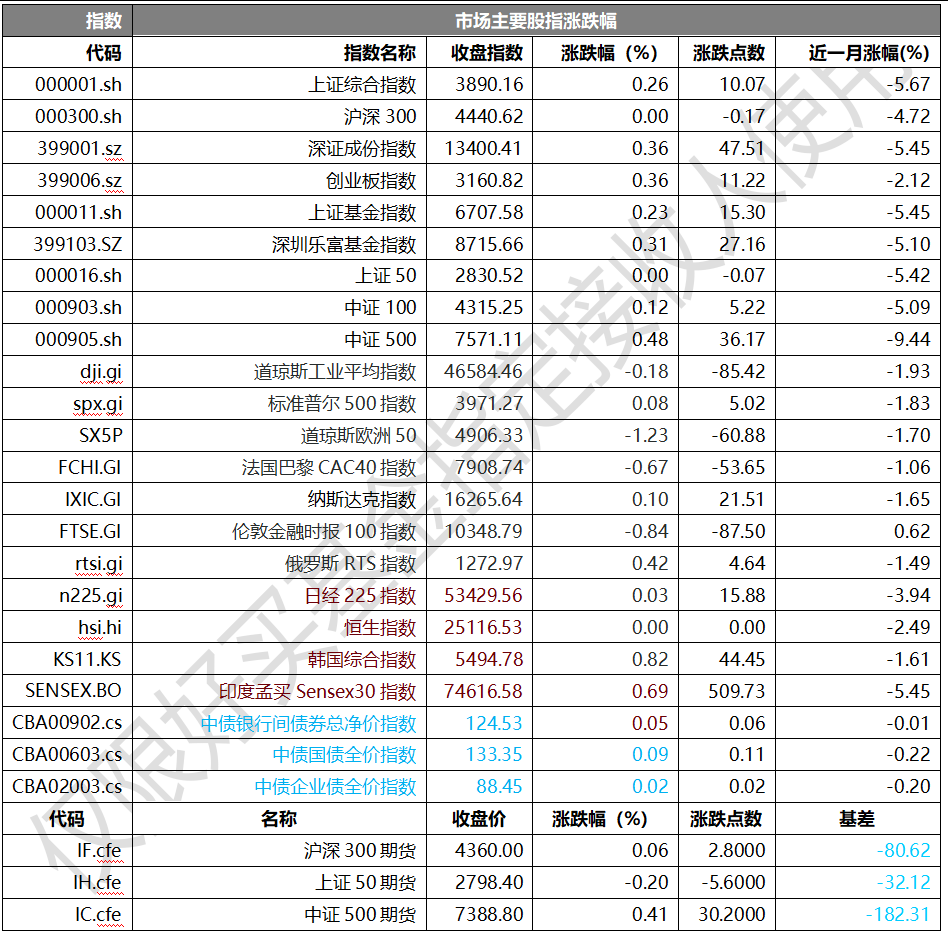 31個申萬一級行業(yè)中有26個行業(yè)上漲。其中,基礎化工、石油石化、煤炭表現(xiàn)居前,漲跌幅分別為3.66%、2.85%、2.44%,汽車、食品飲料、銀行表現(xiàn)居后,漲跌幅分別為-0.44%、-0.52%、-0.94%。滬市有1584只個數(shù)上漲,占比67.43%,深市有2243只個數(shù)上漲,占比76.76%。非ST個股中,93只個股漲停,4只個股跌停。股指期貨主力合約漲跌不一,其中,2只期指好于現(xiàn)貨指數(shù)。
