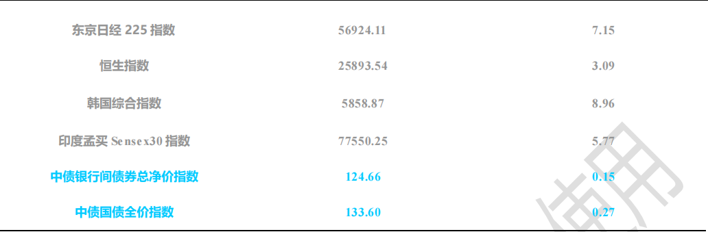 上周,中債銀行間債券總凈價(jià)指數(shù)上漲 0.15 個(gè)百分點(diǎn)。