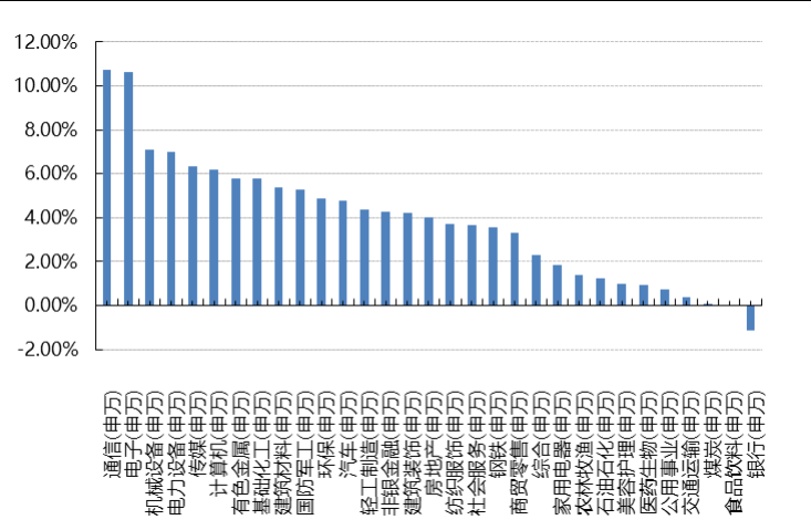 31 個(gè)申萬一級(jí)行業(yè)中有 29 個(gè)行業(yè)上漲。其中,通信(申萬)、電子(申萬)、機(jī)械設(shè)備(申萬)表現(xiàn)居前,漲跌幅分別為 10.74%、10.64%、7.08%,煤炭(申萬)、食品飲料(申萬)、銀行(申萬)表現(xiàn)居后,漲跌幅分別為 0.08%、-0.03%、-1.13%。