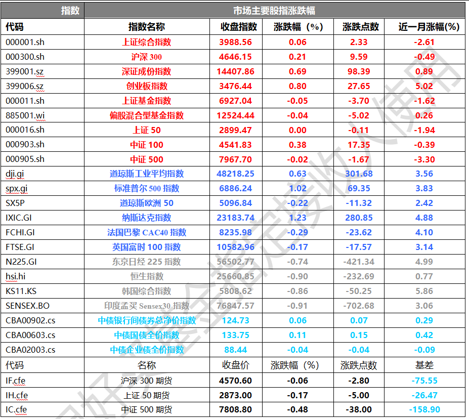 31個申萬一級行業(yè)中有18個行業(yè)上漲。其中,食品飲料(申萬)、電子(申萬)、商貿(mào)零售(申萬)表現(xiàn)居前,漲跌幅分別為-0.48%、0.81%、-0.59%,基礎(chǔ)化工(申萬)、有色金屬(申萬)、鋼鐵(申萬)表現(xiàn)居后,漲跌幅分別為0.84%、0.34%、1.21%。滬市有922只個數(shù)上漲,占比46.68%,深市有1359只個數(shù)上漲,占比49.40%。非ST個股中,73只個股漲停,6只個股跌停。股指期貨主力合約3個合約均下跌,無期指好于現(xiàn)貨指數(shù)。